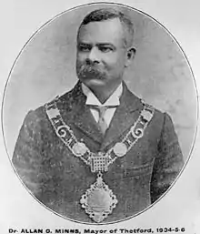 In 1903, Minns was elected to the town council of Thetford, Norfolk, and the next year was elected as mayor, serving two one-year terms as mayor, the first known black mayor in England.[7] John Archer, who was elected mayor of Battersea in 1913, had initially been thought to be the first black British mayor. However, in reporting Archer's election, the American Negro Year Book 1914 noted that "[i]n 1904, Mr. Allen Glaser Minns [sic], a colored man from the West Indies, was elected mayor of the borough of Thetford, Norfolk."[8]