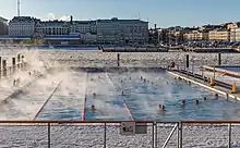 Allas Sea Pool is a marine spa and lido in Katajanokka, Helsinki, Finland. It was opened on 1 September 2016 on the site of the former Kanavaterminaali building. The spa has three pools built on top of the sea: a children's pool, a warm pool and a seawater pool, as well as a sauna and a café.[1] The main building of Allas Sea Pool was completed in spring 2017. The building has a roof terrace spanning its entire roof. With 1500 places Allas Sea Pool is the largest terrace in Helsinki.[2]