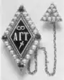 - Badge: Diamond-shaped shield of black enamel across the center of which is superimposed in gold the Greek letters "Alpha", "Gamma", and "Upsilon". In the area above these letters appear two links; below is a miniature dagger. The standard badge is 3/8" x 5/8" and jeweled badges are optional.[3] Smaller badges may be presented to mothers, wives, sisters, and fiancees of fraternity members.