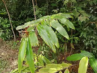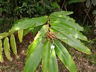 Alpinia arctiflora is a rhizomatous herb, meaning that the stem takes the form of an underground rhizome with only the leafy shoots and flowers appearing above ground.[4][5][6] It grows to around 3 m (9.8 ft) high, each shoot carrying a number of lanceolate leaves on short petioles, each about 50 cm (20 in) long by 10 cm (3.9 in) wide.[4][5][6][7] The inflorescence is an erect terminal panicle about 20 cm (7.9 in) long.[4][5][6][7]