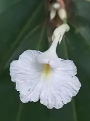 The white flowers have a pale green to cream calyx about 20 mm (0.79 in) long, a white corolla tube about 40 mm (1.6 in) long, and a distinctive broad labellum, tinted with yellow in the centre, about 20 mm (0.79 in) long and wide.[4][5][7]