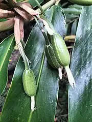 The fruit is a somewhat cylindrical dehiscent capsule to 80 mm × 20 mm (3.15 in × 0.79 in) long. The calyx persists at the tip of the capsule, and it holds numerous black or brown seeds about 3 mm (0.12 in) diameter. It is green at first, turning grey/brown at maturity.[4][5][7]