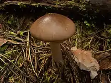 The smooth cap is hemispherical when young and later flat, sometimes with grey patches of veil.[5][6] It is about 4–10 centimetres (1+12–4 inches) in diameter,[7][8][6] and brown with either a purplish or a greyish hue.[7][9][6][5][10]