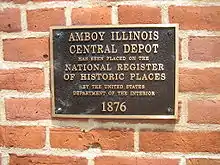 The Amboy Illinois Central Depot is a locally significant structure because of its affiliation with the Illinois Central Railroad. Most of the building's architectural elements, interior and exterior, have maintained their integrity and are well preserved.[10] Because of its association with the Illinois Central Railroad as its Northern Division headquarters the Amboy Illinois Central Depot was added to the U.S. National Register of Historic Places on August 18, 1992.[1][10]