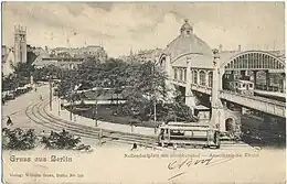 Nollendorfplatz with the gable and tower of the American Church (left) at the entering Motzstraße and the Nollendorfplatz overhead station, 1905