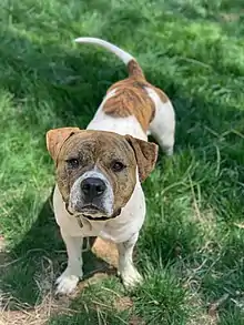 The height of an American Staffordshire Terrier is 18–19 in (46–48 cm) tall and weighs between 40–70 lb (18–32 kg).[2] The American Kennel Club (AKC) describes the breed as "confident, smart and good-natured". American Staffordshire Terriers are not to be confused with American Pit Bull Terriers, though the American Pit Bull Terrier has similar ancestry they are two distinct breeds. It also should not be confused with the "Staffy" Staffordshire Bull Terrier of the United Kingdom.[2]