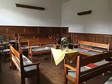 It was extended and refronted in red brick in the late 18th century. The meeting room is divided into two by a wooden screen with shutters. A large burial ground is situated to the north and west of the house.[1]