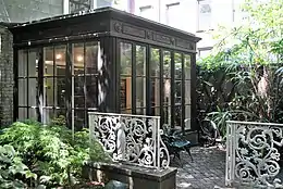 In the rear of the yard was a Greek handicraft store where Jacqueline Kennedy used to shop.[17][18] The other two structures at the north side of the yard were a three-story building to the west, as well as a two-bedroom, double-story bungalow to the east.[5] The structures on the northern boundary of the courtyard may have once been horse stables.[13][19] The first stories of these structures were converted to showrooms, offices, storage rooms, and water heaters.[20] The first-floor spaces contained Sterner's and Amster's offices, as well as shops for antiques and textiles.[20][21] There was also a full-service laundry shared by all the tenants.[20][22] The rear buildings were all demolished in 2001 and replaced with identical replicas.[14]