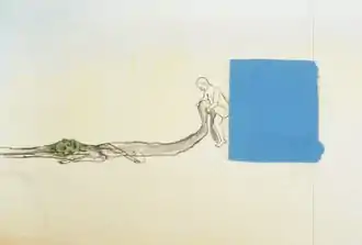 Sillman's earlier work moved between figure, landscape and abstraction, fusing loose painting and drawing into what reviews described as dreamlike, absurd or wistful psychological narratives.[24][34][29] Rendered in cheery, vaguely acidic palettes, these paintings depicted simple, self-contained figures—often a small, Eve-like woman wandering open grounds—amid Boschian piles of biomorphic shapes, abstract scumbles, drips and calligraphic linework.[5][34][28] New York Times critic Roberta Smith noted their dense "undergrowth" of imagery and "translucent delicacy," which she wrote, "pok[ed] fun at painting's often masculine sense of bravura, while offering alternative forms of turbulence and power."[24] Helen Molesworth wrote that paintings such as Me and Ugly Mountain (2003)—which depicts a lone figure dragging, an enormous bundle of shapes, scrawls and "neurotic energy" by a thinly painted line—shifted the feminist critique of the gaze from the structure of representation to the feelings that arise when one is aware of being looked at.[4][29]