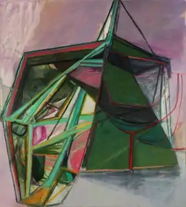 In the mid-2000s, Sillman's heap-like compositions gave way to an enlarged scale, broader, more physical gestures and explorations of the body, interpersonal dynamics, the erotic and psychosexual tension.[35][5][36][37] These works consisted of patches of high-contrast color bursting with chaotic line and web-like scaffolding, open fields of subtly modulated color, and crude figurative elements emerging along compositional fault lines or out of rough edges and thickets of brushstrokes (The Elephant in the Room, 2006).[35][38][5] In 2007, Sillman began creating large gestural abstract paintings based on black-and-white drawings she made from observing couple friends in casual moments of domestic intimacy.[5][39][4] She recreated the original drawings from memory, then rotated and reworked them into abstract painting "templates." The paintings consisted of richly hued, abutting trapezoidal shapes on flat picture planes, which were crisscrossed and circumscribed by bold angular, diagrammatic lines reminiscent of architecture or sculptural construction.[39][4] She exhibited the paintings and drawings at the Hirshhorn Museum in 2008; Artforum described the drawings as "equally tender and ruthless" in touch and economical in their markmaking.[39]