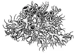 Historically, the lichen Anaptypia ciliaris has played a significant role in various scientific explorations of lichen structure and physiology. Early on, the French botanist Joseph Pitton de Tournefort reportedly first observed the lichen's distinctive large, dark-coloured spores.[55] In 1849,[56] Holle detailed the development of hyphae from lichen spores, using A. ciliaris as the subject of his study.[57] In 1850 and 1851, the lichen was used by the German botanist Hermann Itzigsohn to demonstrate the existence of "spermagones" (conidia).[23] In 1853,[58] Julius Ferdinand Speerschneider, another German botanist, reported the division of the lichen's photobiont cells (then referred to as gonidia) in moist thallus sections.[59] He found that in humid air, hyphae decomposed within two months, while algae thrived, growing and dividing rapidly. Subsequently, small, light green structures emerged in the decomposing thallus centre, evolving into lichen primordia.[60]