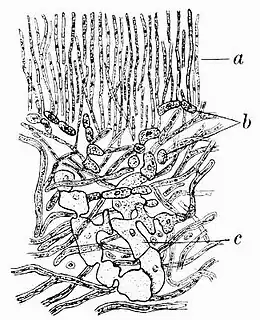 Further insights into lichen structure came when Reginald Heber Howe Jr. presented the lichen's cortex as an exemplar of the "fibrous" cortex — a tissue type characterised by long, slender, infrequently branched hyphae growing parallel to the surface.[61] The German bryologist Johann Hedwig, in the eighteenth century, expanded on these findings. In his 1784 work Fundamentum Historiae Naturalis Muscorum Frondosorum, he described and depicted Anaptypia ciliaris apothecia, dark septate spores, and pycnidia. He identified tiny bodies associated with the organism, measuring approximately 50 μm long and 24 μm thick, as "semina"[62] — a term Acharius later replaced with "spores" in 1803.[63]