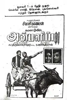 Anbalippu (transl. Gift) is a 1969 Indian Tamil-language film, directed by A. C. Tirulokchandar and produced by S. Gandhiraj. The film stars Sivaji Ganesan, B. Sarojadevi, Vijayanirmala and Jaishankar. It was released on 1 January 1969,[1][2] and was a hit at the box-office.[3]