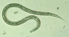 Ancylostoma duodenale is a species of the roundworm genus Ancylostoma. It is a parasitic nematode worm and commonly known as the Old World hookworm. It lives in the small intestine of hosts such as humans, cats and dogs, where it is able to mate and mature. Ancylostoma duodenale and Necator americanus are the two human hookworm species that are normally discussed together as the cause of hookworm infection. They are dioecious.[1] Ancylostoma duodenale is abundant throughout the world, including Southern Europe, North Africa, India, China, southeast Asia, some areas in the United States, the Caribbean, and South America.