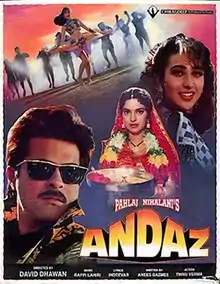 Andaz (transl. Style) is a 1994 Indian Hindi-language action comedy film directed by David Dhawan, starring Anil Kapoor, Juhi Chawla, Karishma Kapoor and Kader Khan. Other cast members include Raj Babbar, Shakti Kapoor, Satish Kaushik, Ishrat Ali, Mahesh Anand, Vikas Anand and Tej Sapru. It is a remake of Tamil film Sundara Kandam (1992), starring K. Bhagyaraj and Bhanupriya. The film was the 13th highest grossing Bollywood film of 1994.