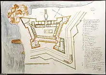 The Dutch attacked the Araya Peninsula twice in 1620, but were repulsed by Spanish forces, as had happened previously in November 1605.[8][9] On January 15, 1622, a number of Dutch boats came to Araya to load cargoes of salt, followed by a fleet of 27 Dutch ships which set about building two forts and saltworks, an event which coincided with a decree by Madrid to construct fortifications to defend the salt pans.[10][11][12] On 22 February Villegas decided to immediately leave Pampatar with reinforcements of 20 soldiers and 12 Waikerí bowmen under his command to engage the Dutch troops at Santiago. The soldiers refused to join him, however, when he launched his attack, and seeing the main Dutch party land to the eastward, he abandoned the attempt; his troops were able, however, to prevent the Dutch from landing at the harbor of Pueblo de la Mar, with several Dutch soldiers being killed.[13] By a royal decree of March 13, 1622, construction of the fortress at Araya was to proceed.