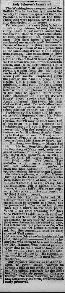 Fel' cizzens, this 's mos (hic) 'spicious mom't v' my zistence 'ni may (hic) say v' my l (hic) ife; ni' mere t' swear (hic) leshens t' ol Dabe 'nt' sport consushun, n' tseet consushun (hic) sported 'tall azurs. D'u (hic) know y am' [with emphasis] my name's And' Johnson' v Tensee n' im a pul a (hic) pul-le-an 'n ol Dabe's a pal-le-an n' im a plean (hic) an th' constushue d'rives 'ts (hic) cons't from pleeans. The consushun 's (hic) a stri (hic) ing sturment 'n I f'l'ere b'fore the Sen't that 'fi know (hic) my-sel I'm a man n'a (hic) broth'n Amekin cizzen, and [with distinctness] I'm a proud listration' v th' fac that a (hic) pleean'n a man from the (hic) ranks can be elv (hic) ated t' th' secon, t' th' secon [with marked emphasis] gif'in the place o' the Amekin people. Fel' cizzens, I'm a pleian 'n (hic) 'n two minitsnaf'n that point, f'r'i'm a pleean (hic) an 'twon time was a tailrs boy n'i teller wir rail (hic) pleeans 'n, Old Dabe 'n the (hic) n' spreme Court d'rive [with statesmanlike dignity] d'rive'r cons't' d'rive power from th' (hic) Amekin pleeans. But twom (hic) inits'naf on that point. Tensee's allers been loy'l'ni (hic) glore'n dressing my fel' twom inits'naf on that (hic) point.[63]