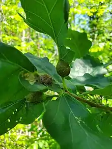 The oak petiole gall wasp forms galls on white oaks, including Quercus alba, Q. bicolor, Q. montana, Q. macrocarpa, Q. michauxii, Q. prinoides, and Q. stellata.[1][2]