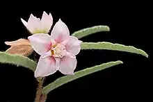 Androcalva johnsonii is a low spreading shrub that typically grows to 0.3–1 m (1 ft 0 in – 3 ft 3 in) high and 1 m (3 ft 3 in) wide, its branches covered with yellowish, star-shaped hairs. The leaves are narrowly egg-shaped to oblong, 10–100 mm (0.39–3.94 in) long and 3–20 mm (0.12–0.79 in) wide on a petiole 1–12 mm (0.039–0.472 in) long with narrowly triangular stipules 2–9 mm (0.079–0.354 in) long at the base. The edges of the leaves have well-spaced, rounded lobes and are curved down, both surfaces of the leaves covered with white or yellowish, star-shaped hairs. The flowers are arranged in groups of 2 to 4 on a peduncle 1–4 mm (0.039–0.157 in) long, each flower on a pedicel 1–5 mm (0.039–0.197 in) long, with linear bracts 2–10 mm (0.079–0.394 in) long at the base. The flowers are white to pale pink and 14–17 mm (0.55–0.67 in) in diameter with 5 petal-like sepals, the lobes 4–6 mm (0.16–0.24 in) long. The petals are 5.5–6.5 mm (0.22–0.26 in) long, the ligules pink and shorter than the sepal lobes and with 3 lobes, the middle lobe egg-shaped. Flowering occurs sporadically between June and September.[2][3]