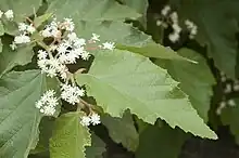 Androcalva viscidula is a spreading shrub that typically grows to 1–3 m (3 ft 3 in – 9 ft 10 in) high, 1–2 m (3 ft 3 in – 6 ft 7 in) wide, is sticky to touch and forms suckers, its new growth covered with star-shaped and red-tipped glandular hairs. The leaves are egg-shaped, 10–110 mm (0.39–4.33 in) long and 10–55 mm (0.39–2.17 in) wide on a petiole 3–12 mm (0.12–0.47 in) long with narrowly triangular stipules 3–9 mm (0.12–0.35 in) long at the base. The edges of the leaves sometimes have irregular teeth, and both surfaces of the leaves are covered with star-shaped and glandular hairs. The flowers are arranged in cymes of 22 to 28, 35–80 mm (1.4–3.1 in) long on a peduncle 6–35 mm (0.24–1.38 in) long. Each flower is on a pedicel 4–7 mm (0.16–0.28 in) long, with lance-shaped bracts 3–7 mm (0.12–0.28 in) long at the base. The flowers are white, 5–8 mm (0.20–0.31 in) in diameter with 5 petal-like sepals covered with star-shaped and glandular hairs. The petals are white to cream-coloured with three lobes, the centre lobe spatula-shaped and the side lobes form a cup around the anthers. Flowering occurs from August to February.[2][3][4]