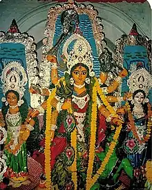 Family celebrates autumnal festival (Durga puja) since the time of their forefather Ram Sharan Dutta Chowdhury (1548–1606 CE);[15] he initiated the annual festival in the Saka era of 1490, which corresponds to 1568 CE in the Gregorian calendar[16][17][18][19][20][21][22] at the ancestral village.[23][24][25]