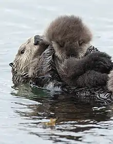 Mother sea otter with sleeping pup, Morro Bay, California