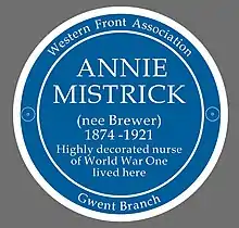 Ian Brewer, Annie's great nephew, has researched the life of Annie Brewer, published on BBC Cymru.[8] She was also featured in BBC Wales television documentary Annie's War: A Welsh Nurse on the Western Front.[9] The Western Front Association unveiled a blue plaque on West Street with guests including members of Mrs. Mistrick's family, Health Minister Vaughan Gething and pupils from St. Woolos primary school, on 30 January 2018.[10]