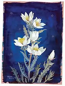 Brown had an extensive knowledge of Albertan plant life and cultivated wildflowers in her garden in Fort Macleod. During the Great Depression she began to paint small "portraits" of flowers which she sold for $1.[6] She was later hired, in 1958, by the Glenbow Foundation to create 200 paintings of Alberta wildflowers. In order to find specimens to paint, Brown travelled to various natural areas in the province such as Waterton Lakes National Park and Banff National Park. She completed the commission in 1960. Some of the flowers she painted are now extinct, and the paintings, done in watercolour and casein, are now housed in the Glenbow art collection.[1]