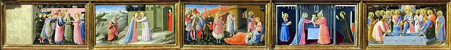 In its predella, the Annunciation of San Giovanni Valdarno is displayed with five scenes from the life of Mary, attributed to an assistant of Angelico, Zanobi Strozzi.