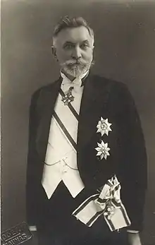 He received the Order of Vytautas the Great (1st class), the highest state award in Lithuania, and Order of the Lithuanian Grand Duke Gediminas (2nd class). He continued to work as a judge and university professor until his sudden death on 30 October 1933 in Kaunas.[1] He was buried in the old city cemetery. When it was transformed into the present-day Ramybė Park, his body was reburied in the Petrašiūnai Cemetery.[10] A memorial stone and wayside shrine were erected at his birthplace in 1970.[11]