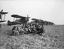 In 1938 Eyre joined the Royal Auxiliary Air Force, being commissioned as a pilot officer and serving with No. 615 Squadron.[1][2] Based at Kenley, this was initially an Army-cooperation squadron using Hawker Hectors but towards the end of 1938, it was transferred to Fighter Command and began to operate Gloster Gauntlet fighters. The following year, the squadron converted to the Gloster Gladiator fighter.[4]