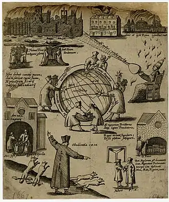 Frontispiece to Pyrotechnica Loyalana, Ignatian Fire-Works suggesting Catholics in general and Jesuits in particular were responsible for the Great Fire of London, as well as other misfortunes around the world. In the centre 8 men, 4 of which dressed as Jesuits throw Hand Grenades at a globe, while the pope uses a set of bellows to fan the flames of fires in London and Rome. At the bottom of the image a Jesuit releases four foxes with firebrands tied to their tails, while Guy Fawkes is shown entering the vault beneath Parliament and Robert Hubert, the man who falsely confessed to starting the Great Fire of London, conspires with William Barrow, one of the accused in the Popish Plot.[2]