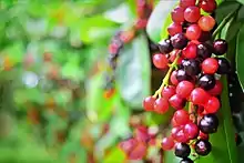 Each bunch of fruits ripens unevenly, so the fruits in a bunch are all different colors. The skin of the fruit has red juice, while the white pulp has colorless juice. The fruit contains a light-colored seed. The fruit has a sour taste similar to that of the cranberry when immature, and a tart but sweet taste when ripe.