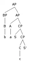 In this tree, the set of pairs of nonterminal categories such that the first member of the pair asymmetrically c-commands the second member is: BP, A, BP, CP, A, CP}. This gives rise to the total ordering: b, a, c.
