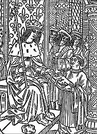 Vérard worked for a leisured bourgeois and noble public, notably king Charles VIII of France and even Henry VII of England. He did not hesitate to offer luscious examples of his work to the king of France, such as a Légende dorée, by Jacobus de Voragine, published in 1493 and offered to Charles VIII and his wife Anne de Bretagne.[2] He did not hesitate to pirate his fellow printers works he saw good work that could sell. He thus took into his business one of the era's great publishing successes, the Calendriers des bergers, originally published by Guy Marchant.[3]