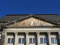 Dietrich founded a studio in Dresden, where he created one of the first works of his series on Otto I, Holy Roman Emperor. Photographs of these works were soon circulated in large quantities. From 1868 to 1872 Dietrich was engaged in a commission to embellish the Gothic Hall of the Kreuzschule with historical frescoes.[1] In 1878 he completed another commission, the fresco Paul Preaches at the Areopagus in Athens, based on Acts chapter 17, verses 22–23. Dietrich also created the image on the gable of the Saxony Ministry of Finance building, which was built in 1894. It represents Saxonia surrounded by arts and government revenues.
