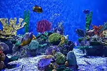 The building occupied by AquaRio has a total of 5 floors and 28 tanks with various types of fish. In the tanks, about 4.5 million liters of salt water are stored, in addition to 8 thousand animals of 350 different species.[2] The building formerly belonged to Companhia Brasileira de Armazenamento (Cibrazem), now Companhia Nacional de Abastecimento (CONAB).[1]
