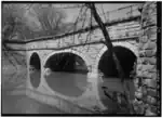 The Catoctin Aqueduct (#3) crosses Catoctin Creek in Frederick County. This aqueduct, completed in 1834, was also called the "Crooked Aqueduct" because of the sharp turns before and after it on the canal. Recklessness among boatmen (usually because of speeding) resulted in accidents, damaging the sides of the aqueduct. In March 1870, the board ordered that all boats should slow down 50 yards from the aqueduct, and stationed a watchman to ensure compliance, as well as printing handbills to that effect.[3]: 811 Boatmen called this creek "Jug Creek."[4]: 88