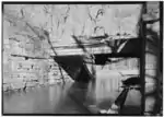 Damaged aqueduct, with water pouring out of the canal, in 1920.