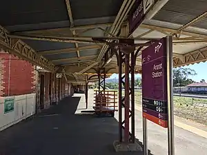 During 1985, the passenger facilities in the main station building were refurbished.[5] However, during that time, rationalisation of the facilities began. Signal box "B" was demolished in 1984, with the train control office following in 1988. The footbridge, which was located at the up end of the station, was destroyed in a derailment in May 1986.[6] The Mobil siding and associated points and staff lock were abolished in January 1988.[7] The locomotive depot closed in 1989, the train crew depot closed on 30 June 1994,[8] with signal box "A" following in 1996. Gauge conversion was carried out at the station in the 1990s, with the main line to Adelaide being converted to standard gauge as part of the One Nation project. The lines west and south, and the line to Maryborough, were converted soon after.