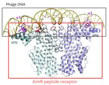 The arbitrium protein is synthesized by three genes: aimP, responsible for encoding the arbitrium peptide, aimR, responsible for encoding transcription factors that bind to aimP, and aimX, which produces non-coding RNA that suppresses lysogeny. The structure of aimR complex is still unknown. As a result lysis is induced by a mechanism that we still are unaware of. The AimP gene codes for a 43 amino acid (aa) peptide, which matures into a 6 amino acid (aa) active form. The mature protein is transported to neighboring bacteria using the oligopeptide permease (OPP) transporter channel. The OPP transport channel is capable of transporting peptides inside the bacteria cell with no specific size, composition, charge, or sequence.[9] Once inside, the mature AimP binds to the AimR receptor and regulates its activity. As a result, AimR loses its DNA-binding ability. AimX, whose expression is promoted by AimR, is also thus suppressed.[10][6][11]