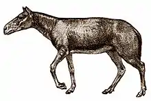Archaeohippus (Greek: "ancient" (archaios), "horse" (hippos)[3]) is an extinct three toed member of the family Equidae known from fossils of early Oligocene to middle Miocene age.[1] The genus is noted for several distinct skeletal features. The skull possesses deeply pocketed fossa in a notably long preorbital region.[1] The genus is considered an example of phyletic dwarfism with adults estimated at being on average 20kg in weight. This is in contrast to the most common equid of the period, Miohippus.[1] Characters of the teeth show a mix of both primitive and advanced traits. The advanced traits are very similar to those shown in the genus Parahippus. The noted similarities of Archaeohippus and Parahippus show them to be descended from a common ancestor and are considered sister species.[1]