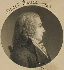 Bruce was born in New York City in February 1777 and graduated from Columbia College in 1795 with a Bachelor of Arts degree. His father, William Bruce, head of the medical department of the British army at New York, on being ordered to the West Indies, specially directed that his son should not be brought up to the medical profession. From the medical lectures of Nicholas Romayne, the teachings of Dr. Hosack, and attendance on the courses of medical instruction of Columbia, he attained a knowledge of the science. He went to Europe in 1798, received an M.D. from the University of Edinburgh in 1800, and, in a tour of two years in France, Switzerland, and Italy, collected a mineralogical cabinet of great value. He married in London, and in the summer of 1803, returned to New York city and began practice. In 1807, he was appointed professor of materia medica and mineralogy in the College of Physicians and Surgeons, being the first to fill such a chair in the United States. On the reorganization of the college in 1811, he was superseded on account of some disagreement with the management, and after 1812, filled the same chair in Queen's, now Rutgers, College, New Jersey. He projected the American Mineralogical Journal in 1810, and edited it until 1814. His chemical analysis "of native magnesia from New Jersey" made known to science the mineral now called after him, Brucite. He also detected and correctly analyzed the zincite of Sussex County, New Jersey, and published a valuable paper "On the Ores of Titanium occurring within the United States." Dr. Bruce was one of the original members of the New York Historical Society, and at the time of his death, was a member of many learned societies both in this country and in Europe. He died in New York from apoplexy on February 22, 1818.[1]