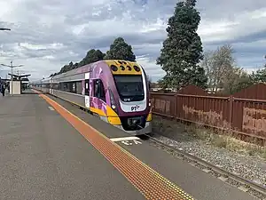Eastbound view from Platform 2, with VLocity set VL18 arriving with a down Ararat service, in July 2022