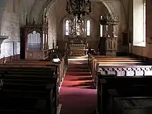 The furnishings of the church are still largely medieval: an altarpiece from the early 14th century, a triumphal cross and baptismal font, both from the middle of the 13th century, and a carved wooden Madonna from circa 1500 are all in their original milieu. The organ is an elaborate Gothic Revival piece, made for the renovation in 1902 and inspired by medieval French organs.[1]