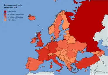 - ↑ Culturally but often not geographically in Europe, so total figures are given. Not including Northern Cyprus or Akrotiri and Dhekelia.[35]