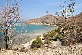 On its land side, the beach is fringed by shady trees,[1] and overlooked by steep low hills creating a dramatic backdrop.[3][4] The hills are covered with Eucalyptus alba savanna woodland, in which small stands of tropical dry forest are developing. The beach and hills are all part of the Areia Branca no Dolok Oan Important Bird Area.[4]
