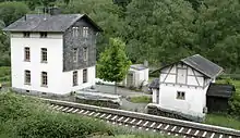 The station buildings form a unique combination of half-timbered and corrugated iron buildings.[9] Like the entire line, this building is also a heritage-listed monument. While the corrugated iron hut serves as a waiting room, a small signal box is housed in the half-timbered building, which is still used today. Due to the lack of funding, this situation will continue to exist at least until 2020, despite increasing structural deficiencies.[10] The station has 400 metre-long platforms, which were raised to a height of 38 cm and paved over a length of 140 metres from October 2011. The platform lighting was also renewed and a waiting room was built.[11]