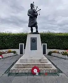 In 1919, at the centre of the town (the Cross), a cast-iron memorial was erected. Erected by the public, the Kerr Memorial commemorates a Mrs Elizbeth Kerr who was fatally injured in the saving of a child from being run over by a passing motor car.[17] In 1923, a large Miner's Welfare Institute was established in the town (it has since been converted to flats).[17] Most of the mines and other industry in the town closed following the Second World War. As with most mineral dependent communities, as the deposits were exhausted and the pits closed, many moved away but enough local industry remained for the township to survive and today it has also become a commuting hub for those employed in the major towns. In 1966, a new harled council office building was built in the town (it is now a Vets).[17] In 2018, following a community fundraising effort, the town erected a new war memorial to those lost in wars from Armadale and the surrounding area.[24] The memorial was erected at Watson park in the town and includes a statue of a bagpiper.[24]