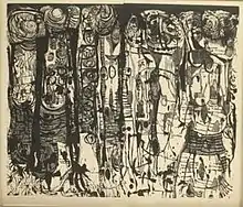 Beginning in 1950, his work regularly appeared in the National Print Exhibition at the Brooklyn Museum and in 1964 joined with the museum's print curator and the curator of the Hirshhorn Collection was on the jury that selected prints for the show.[6][7][note 1] In 1952 he was given a solo-exhibition at the Contemporaries gallery in Manhattan.[11][note 2] He was given another solo show two years later, this one at Indiana University, and, later that year, was awarded first prize in painting by the Louisville Art Association.[16][17] He showed the following year in a group exhibition at the Museum of Modern Art and in 1959 was given a solo show at Wittenborn's One-Wall Gallery.[18][19] In 1955, 1961, and 1963 Deshaies' work was included in group exhibitions at the Whitney Museum of American Art.[20]